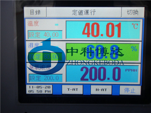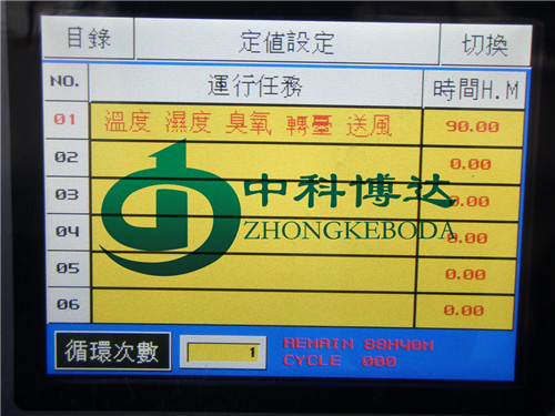 二、臭氧老化試驗箱的溫度、濕度及臭氧濃度設置可通過主界面點擊想對應位置來去設定貨修改參數,臭氧老化試驗試驗箱定時設定可通過觸摸屏里的時間設定菜單來設置(H:小時、M:分鐘),如2小時30分鐘,則設定“02H30”,設好后點擊主界面右下角的運行開關,則可啟動試驗箱。
